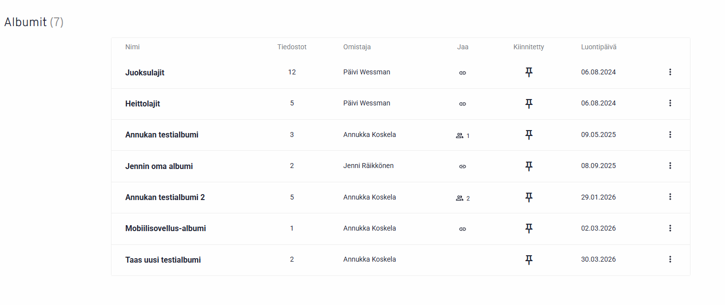 2. Luettelonäkymässä näet samat asiat kuin ruudukkonäkymässä, kansikuvaa lukuun ottamatta. Lisäksi näet albumin luontipäivän.