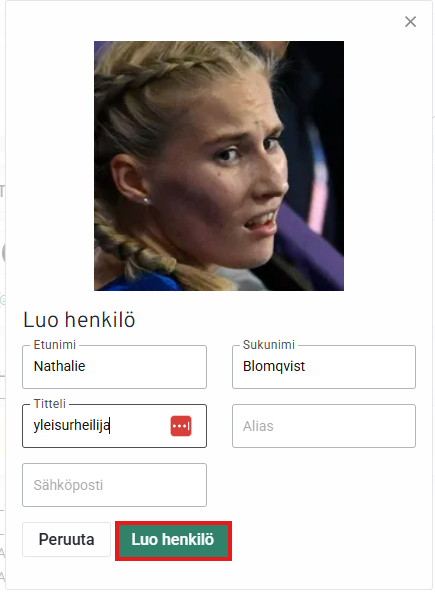 Täydennä Henkilöt-kohtaan kuvassa olevan henkilön tiedot. Klikkaa lopuksi Luo henkilö.