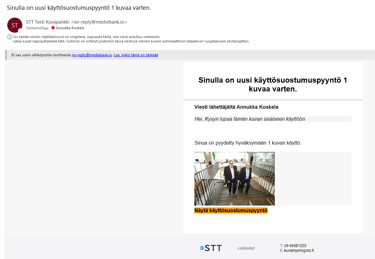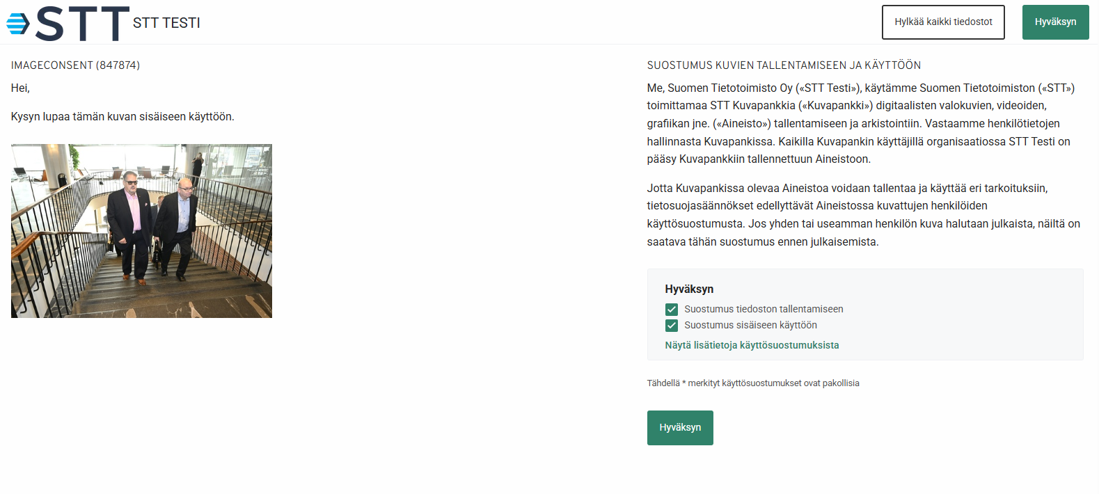 Kun käyttösuostumus lähetetään, vastaanottaja saa vahvistuspyynnön sähköpostitse. Vastaanottajalla on mahdollisuus hyväksyä tai hylätä kuvien käyttö linkin kautta.