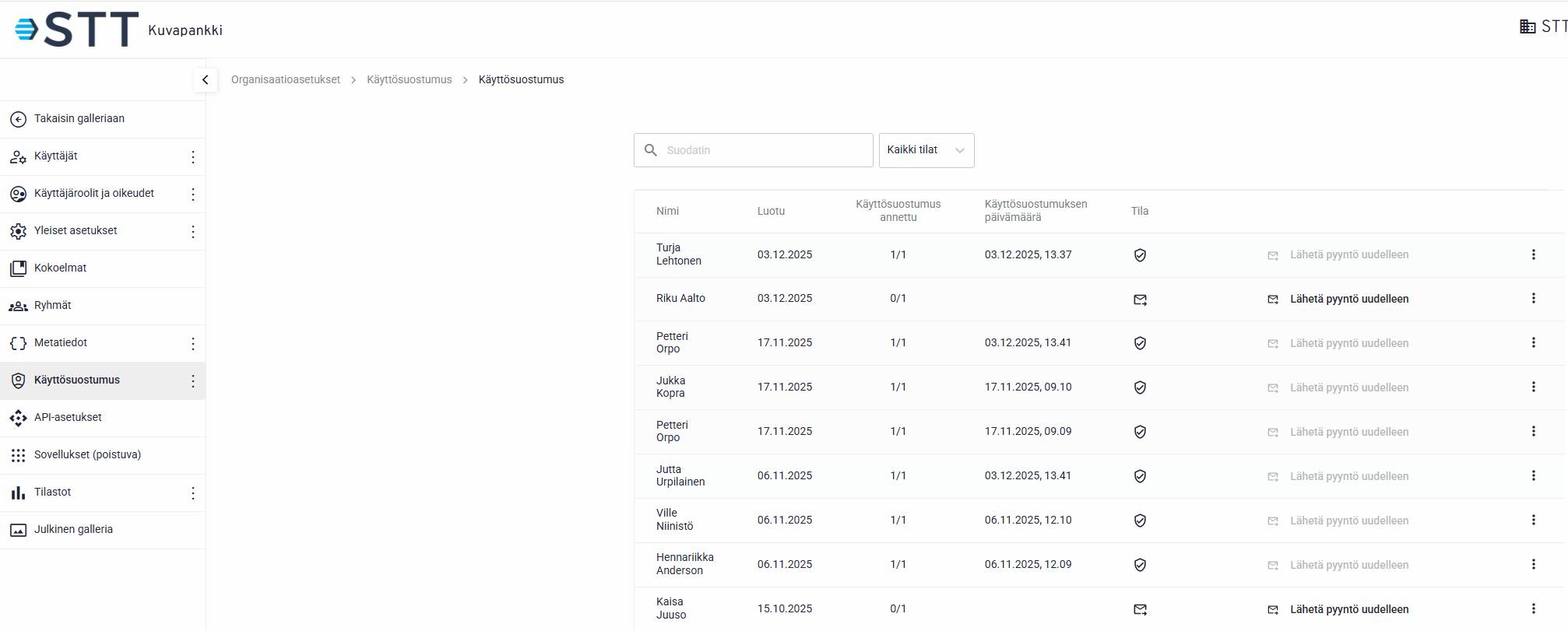 Kun vastaanottaja on hyväksynyt tai hylännyt käytön, siitä lähetetään ilmoitus kuvapankkiin. Hyväksytyissä tai hylätyissä kuvissa on kuvake, joka selventää, mitä sovelletaan.