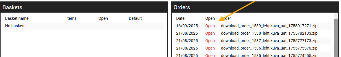 You can see all your orders in User Details in the Orders section. By clicking the Open link, you can download the order again.
