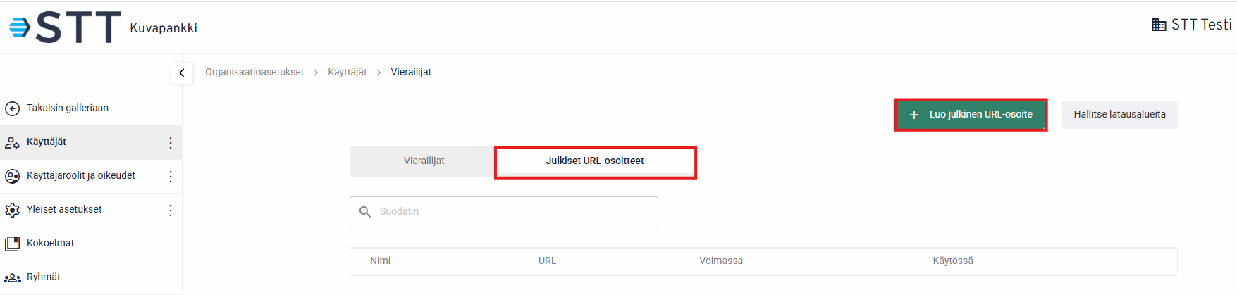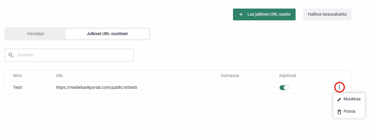 Valitse Julkiset URL-osoitteet, ja klikkaa sen jälkeen Luo julkinen URL-osoite.