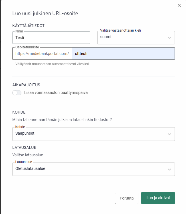 Anna linkille nimi, lisää osoitetunniste ja halutessasi aikarajoitus. Voit valita, latautuvatko vierailijan lähettämät kuvat Saapuneet-kansioon vai suoraan Galleriaan, jolloin ne ovat kaikkien käyttäjien nähtävillä. Paina lopuksi Luo ja aktivoi.