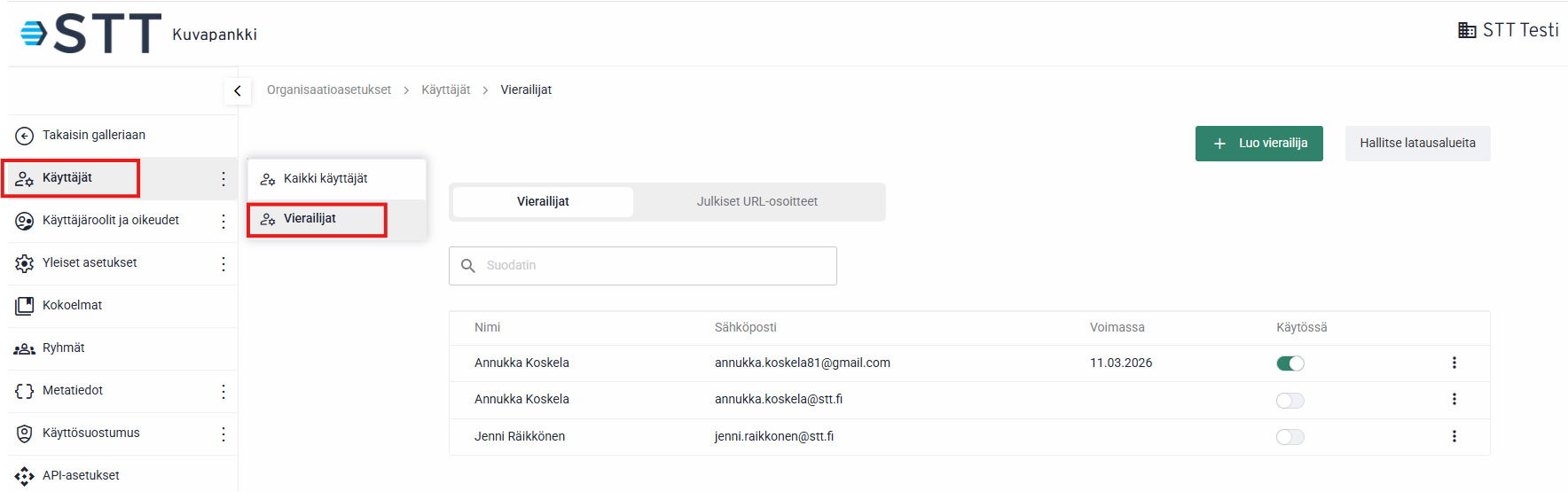 Klikkaa ensin nimikirjaimiasi oikeassa yläkulmassa, ja valitse Organisaatioasetukset. Klikkaa sitten Käyttäjät ja Vierailijat. Vaihtoehtoisesti avaa vasemmasta alakulmasta Saapuneet-kansio, klikkaa ylhäällä oikealla kolmea pistettä ja valitse Luo ja kutsu vierailijoita.