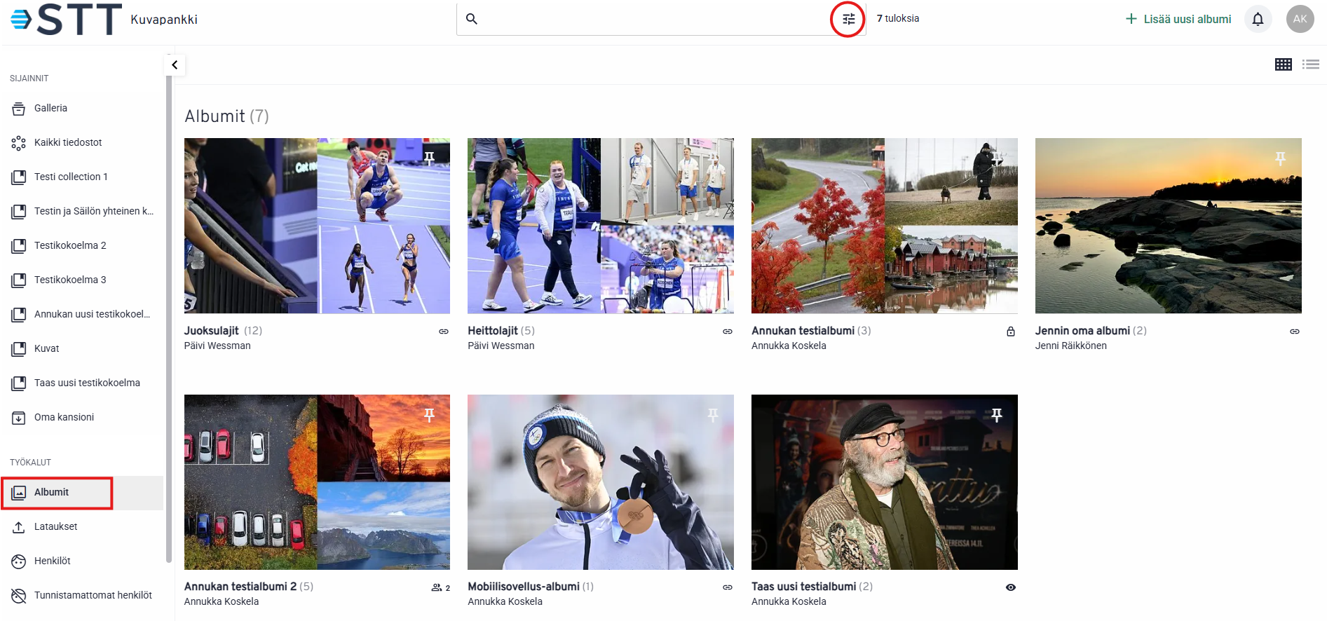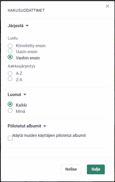 Pääset muokkaamaan järjestystä ja albumien näkyvyyttä, kun napsautat ensin albumikuvaketta vasemmassa reunassa. Klikkaa sen jälkeen yläreunassa hakusuodattimia.